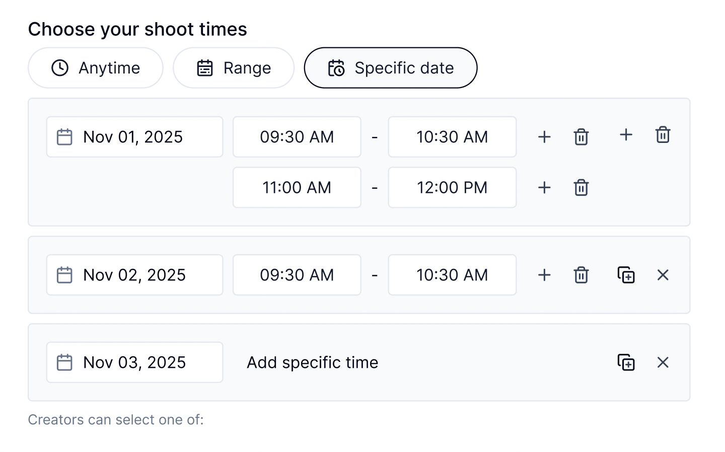You can set a unique time per date or duplicate the same time across several. This is perfect for shoots tied to calendar events, product launches, or one time activations.
